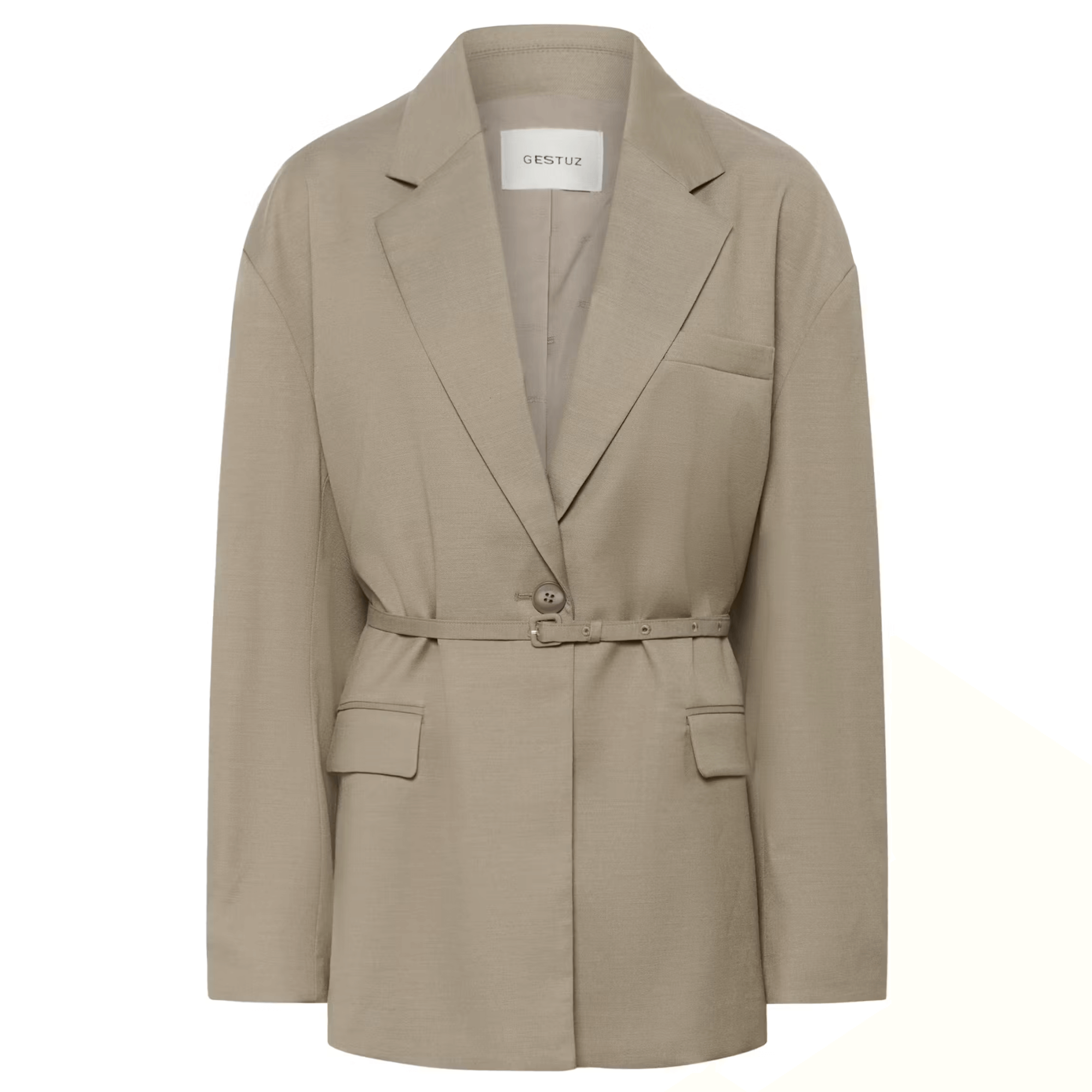 Nella is een prachtige blazer uit de Gestuz collectie. Oversized fit maar wel te tailleren uiteraard, heerlijke zand kleur die heel mooi staat met alle lichtblauwe items uit de Gestuz collectie. Praktische informatie: Deze blazer biedt een relaxte pasvorm, klassieke reverskraag en verstelbare tailleband. Voorzien van lange mouwen en praktische zakken, geschikt voor zowel kantoor als casual momenten. Verborgen elastiek bij de manchet. Dunne, afneembare dubbel gewikkelde riem.